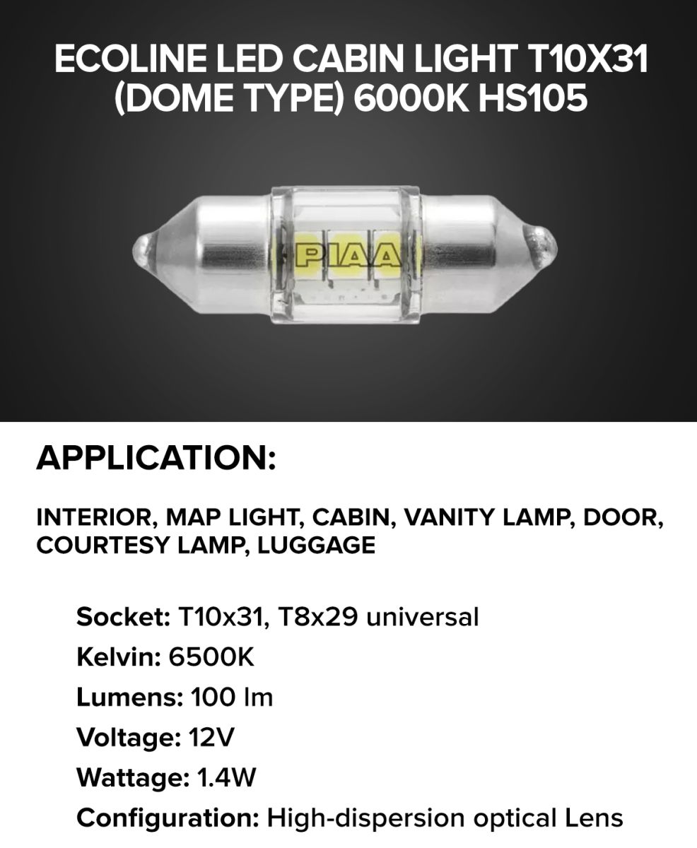 PIAA Ecoline LED Cabin Light T10X31 (Dome Type) 6000K HS105